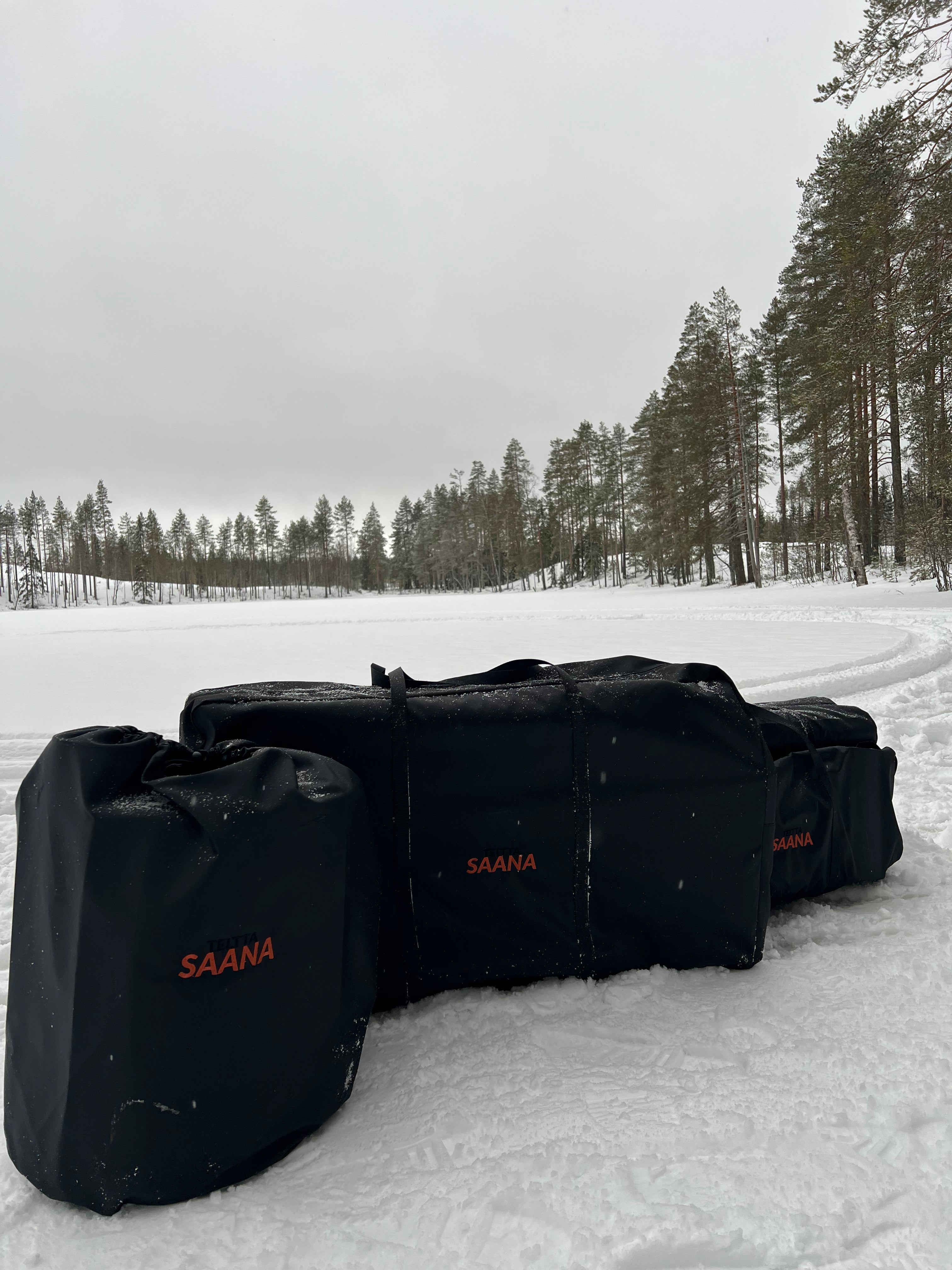 Telttasauna + Narvi-kiuas + piippu + kipinäsuoja + lämpösuoja + kantolaukut.